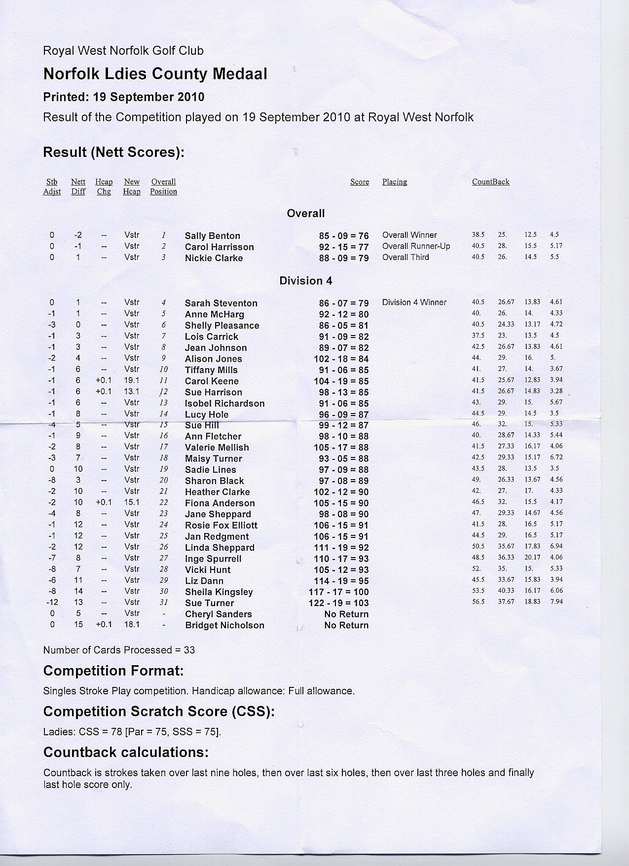 Handicap Cup - Lorna Turnbull (Middleton Hall) 100-28-72 Scratch Cup & prize - Phon Green (Bawburgh) 93 gross 2nd Handicap - Cherry Bishop (Royal Norwich) 94-21-73 3rd Handicap - Shirley Lacey (Bawburgh) 101-28-73 4th Handicap - Janice Harby (The Norfolk) 102-25-77 Team Shield - Bawburgh - 145 (Phon Green, Shirley Lacey, Pat Warnes) CSS 76 |